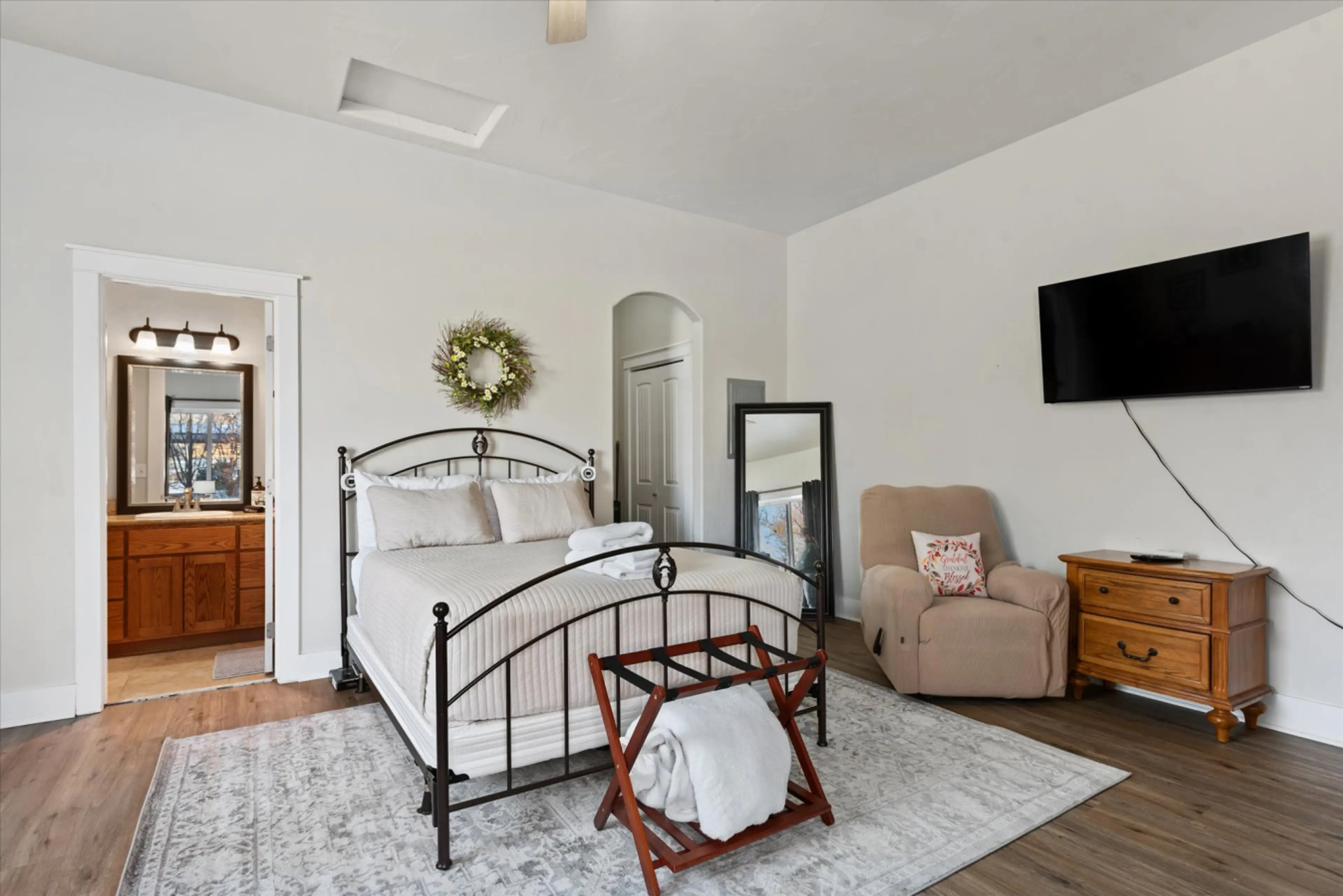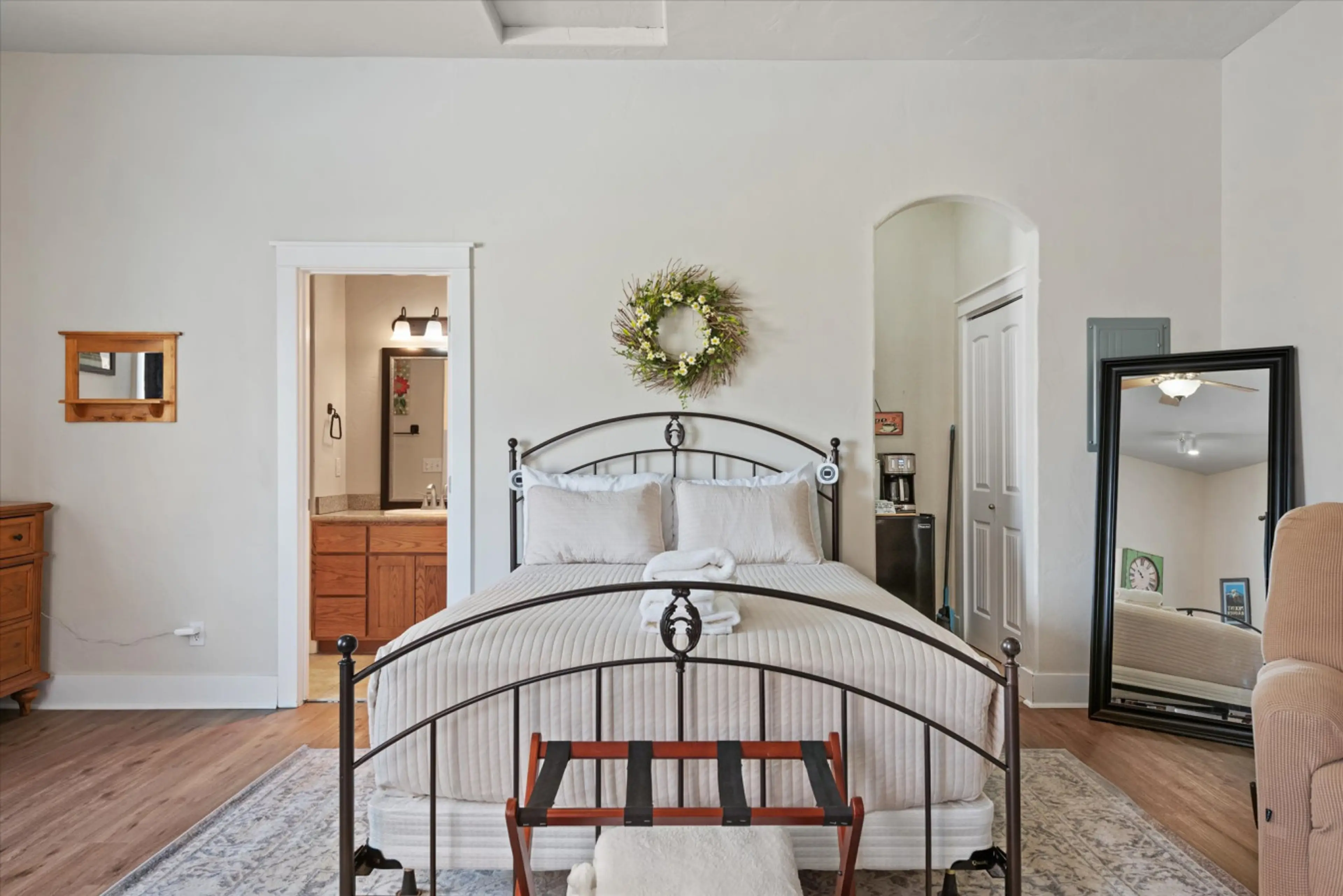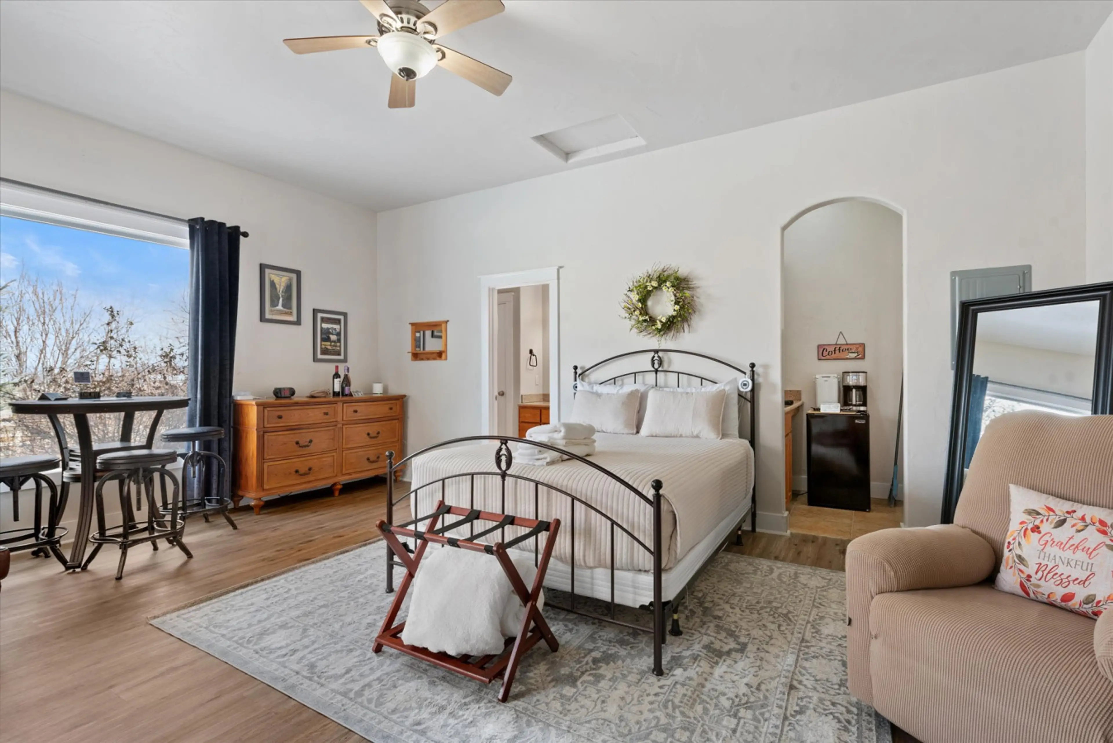 Escape to a cozy retreat in our charming casita, designed to offer you tranquility and comfort. This inviting studio features a queen luxury pillowtop mattress and a well-equipped kitchenette with a mini fridge/freezer, coffee maker and microwave, perfect for preparing light meals. The large windows...
